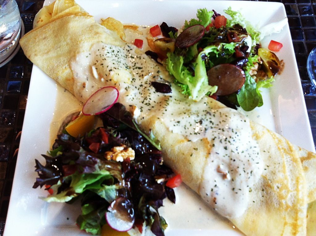 | Creamy Chicken & Mushroom Crepe, $18. |
